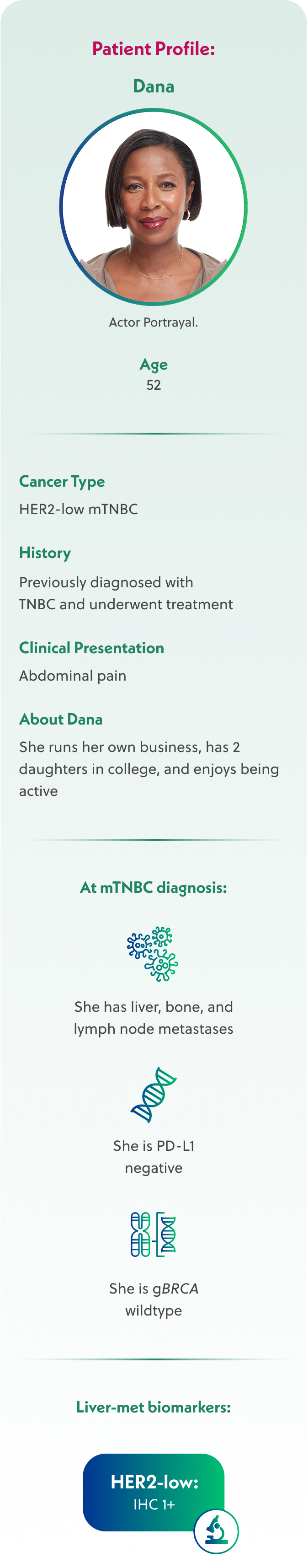 Dana (52) is living with HER2-low (IHC 1+) mTNBC. Could TRODELVY be her next option?