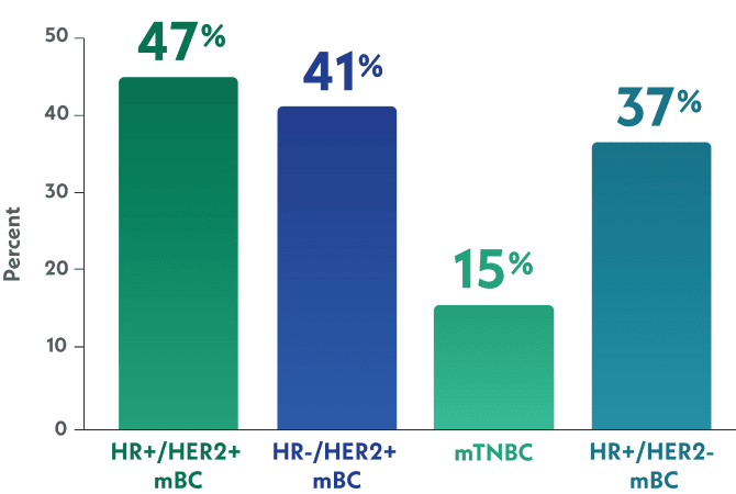 References: 1. National Cancer Institute Surveillance, Epidemiology, and End Results Program. Cancer stat facts: female breast cancer subtypes. Accessed October 10, 2025. https://seer.cancer.gov/statfacts/html/breast-subtypes.html 2. Al Sukhun S, Temin S, Barrios CH, et al. Systemic treatment of patients with metastatic breast cancer: ASCO resource-stratified guideline. JCO Glob Oncol. 2024;10:e2300285. doi:10.1200/GO.23.00285 3. Dent R, Trudeau M, Pritchard KI, et al. Triple-negative breast cancer: clinical features and patterns of recurrence. Clin Cancer Res. 2007;13(15, pt 1):4429-4434. 4. Punie K, Kurian AW, Ntalla I, et al. Unmet need for previously untreated metastatic triple-negative breast cancer: a real-world study of patients diagnosed from 2011 to 2022 in the United States. Oncologist. 2025;30(3). 5. Moy B, Rumble RB, Come SE, et al. Chemotherapy and targeted therapy for patients with human epidermal growth factor receptor 2–negative metastatic breast cancer that is either endocrine-pretreated or hormone receptor–negative: ASCO guideline update. J Clin Oncol. 2021;39(35):3938-3958. 6. Moy B, Rumble RB, Carey LA. Chemotherapy and targeted therapy for HER2-negative metastatic breast cancer that is either endocrine-pretreated or hormone receptor−negative expert panel: ASCO guideline rapid recommendation update. J Clin Oncol. 2022:40(26):3088-3090. 7. Moy B, Rumble RB, Carey LA. Chemotherapy and targeted therapy for endocrine-pretreated or hormone receptor−negative metastatic breast cancer expert panel: ASCO guideline rapid recommendation update. J Clin Oncol. 2023:41(6):1318-1320. 8. Perry S, Kowalski TL, Chang C-H. Quality of life assessment in women with breast cancer: benefits, acceptability and utilization. Health Qual Life Outcomes. 2007;5:24. 9. Wood R, Mitra D, de Courcy J, Iyer S. Patient-reported quality of life and treatment satisfaction in patients with HR+/HER2- advanced/metastatic breast cancer. Clin Ther. 2017;39(8):1719-1728. 10. Walker MS, Hasan M, Yim YM, Yu E, Stepanski EJ, Schwartzberg LS. Retrospective study of the effect of disease progression on patient reported outcomes in HER-2 negative metastatic breast cancer patients. Health Qual Life Outcomes. 2011;9:46. 11. Burstein HJ, Somerfield MR, Barton DL, et al. Endocrine treatment and targeted therapy for hormone receptor-positive, human epidermal growth factor receptor 2−negative metastatic breast cancer: ASCO guideline update. J Clin Oncol. 2021;39(35):3959-3977. 12. Mosher CE, Johnson C, Dickler M, Norton L, Massie MJ, DuHamel K. Living with metastatic breast cancer: a qualitative analysis of physical, psychological, and social sequelae. Breast J. 2013;19(3):285-292.